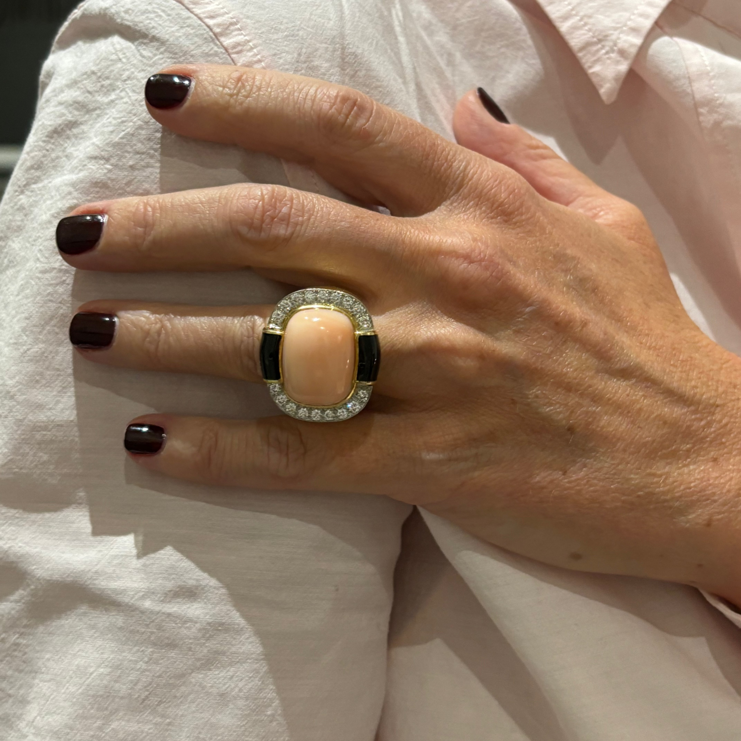 Bague Cocktail de laMaison DAVID WEBB en or jaune 750/1000 (18k), sertie d’un cabochon de corail, onyx et diamants.