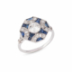 Magnifique bague en platine et diamants. Elle est composée d’un diamant central de 1,45 carat, surmontant plusieurs diamants demi-taille. La monture est ajourée à décor géométrique.