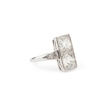 Décor géométrique serti de 2 diamants de 0.70 carat environ, taillés à l’ ancienne, et épaulés de plusieurs diamants.