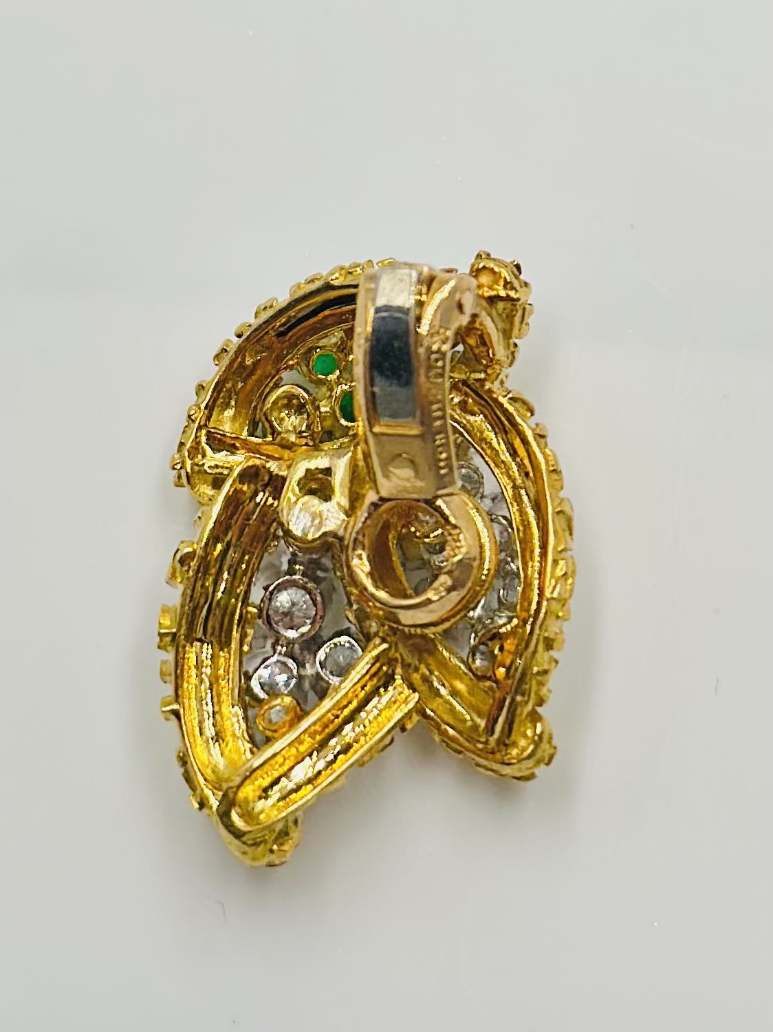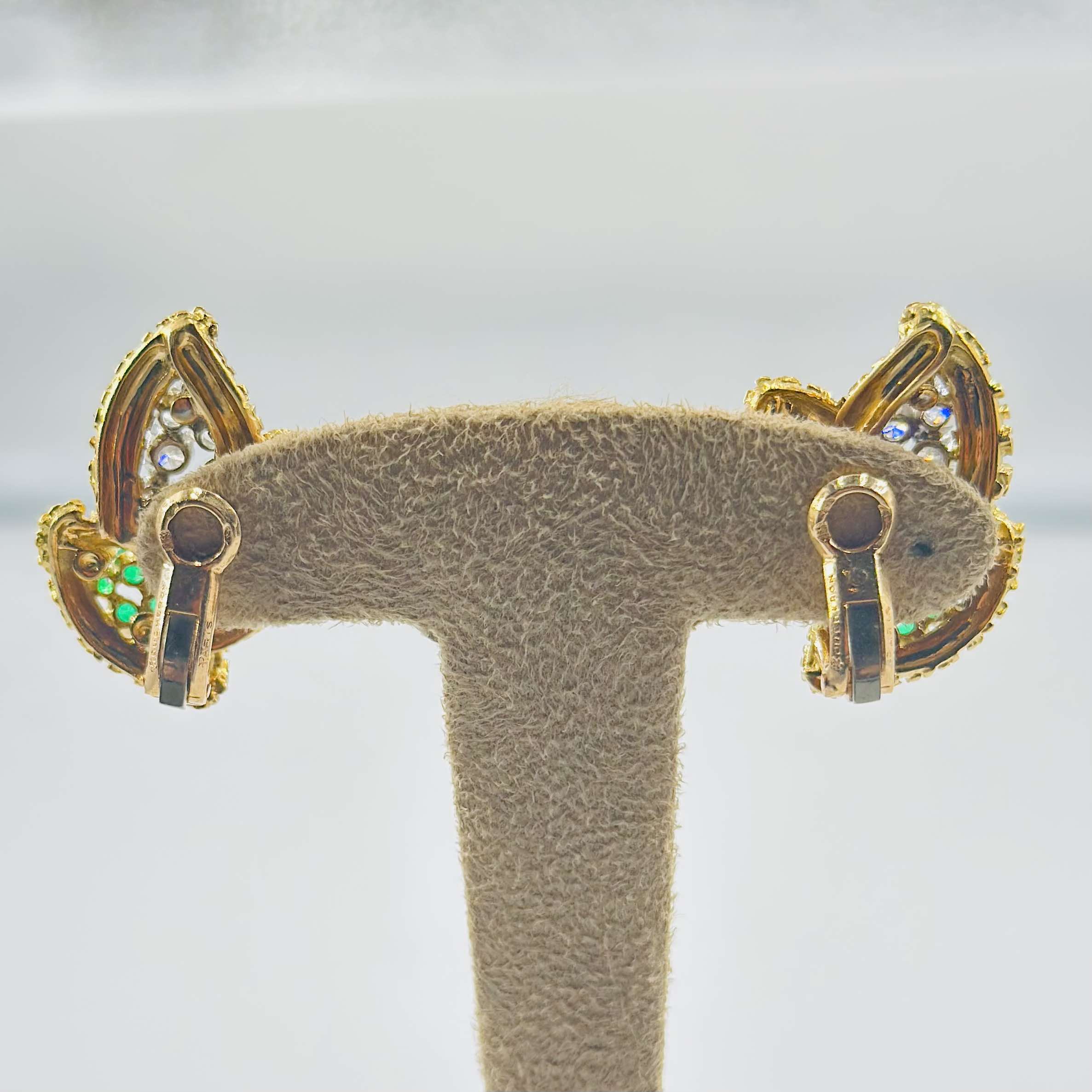 Boucles d’oreilles de la Maison BOUCHERON en or jaune texturé 750/1000 (18 K) à motifs de feuilles serties de diamants et d’émeraudes.