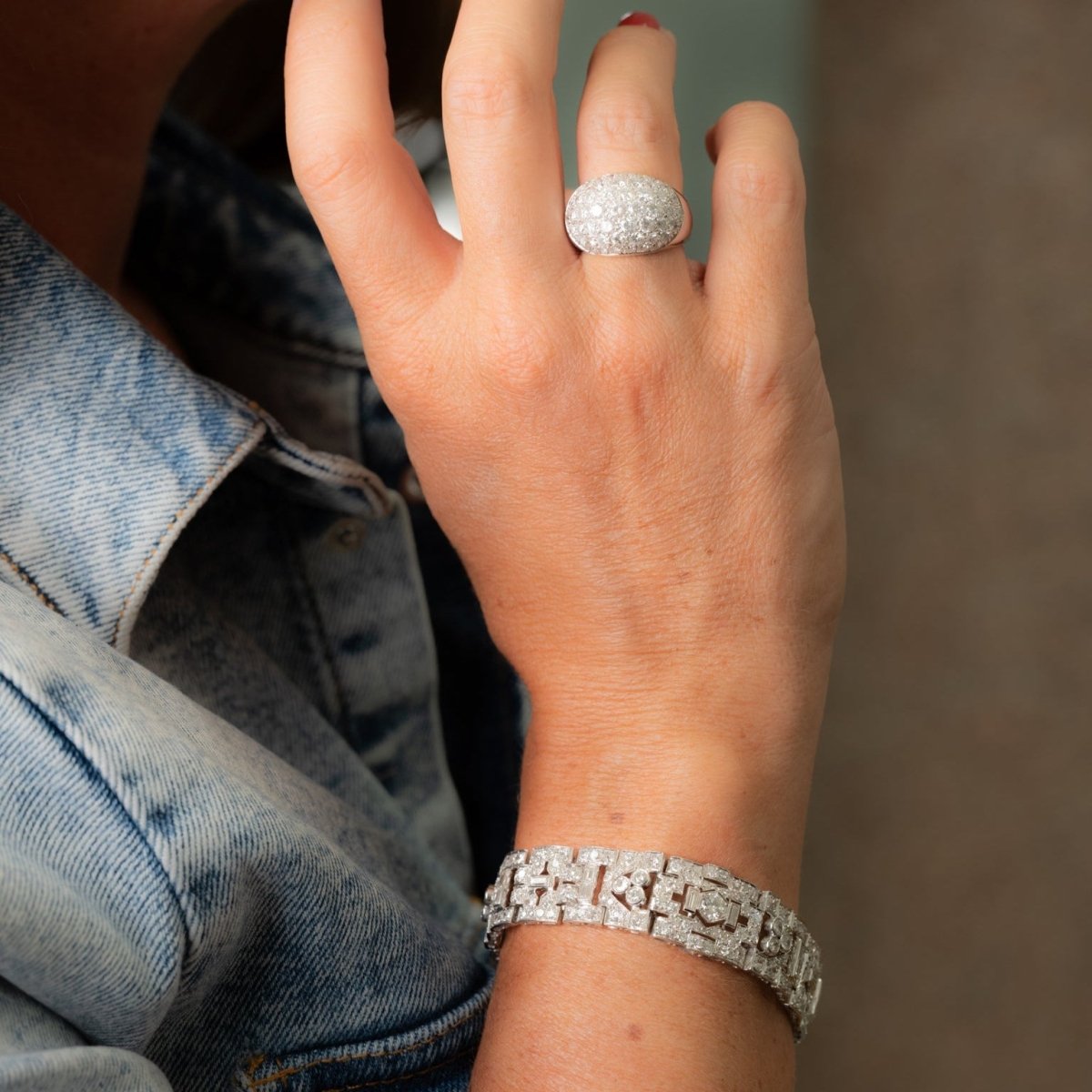 Bracelet Souple Art déco en or blanc 18K ( 750/1000)et platine, les maillons articulés ajourés sertis de diamants totalisant 20 carats