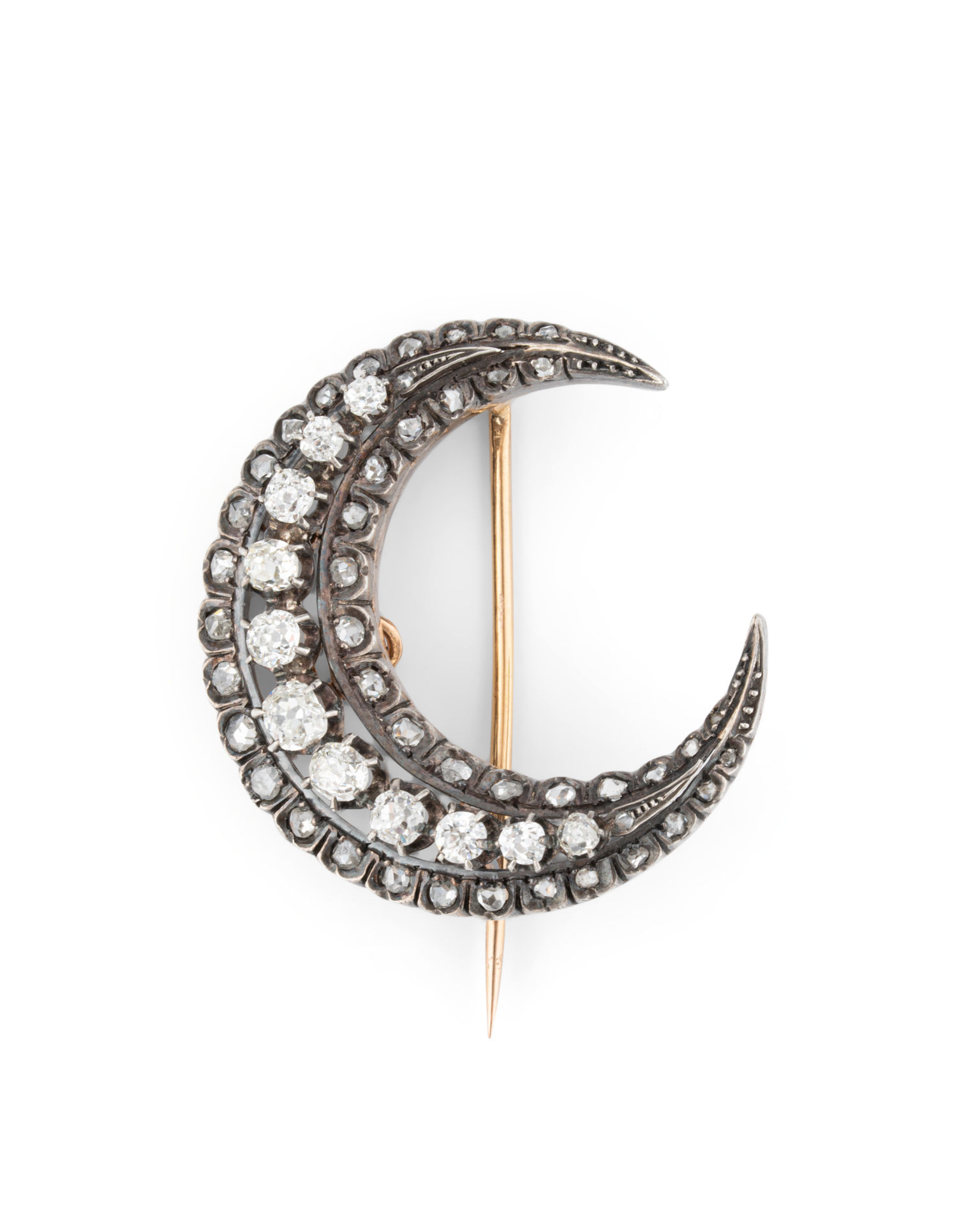 Broche en or jaune 750/1000 (18 k) et argent serti au centre d’un diamant principal entouré de rose et retenant un diamant poire en pampille.