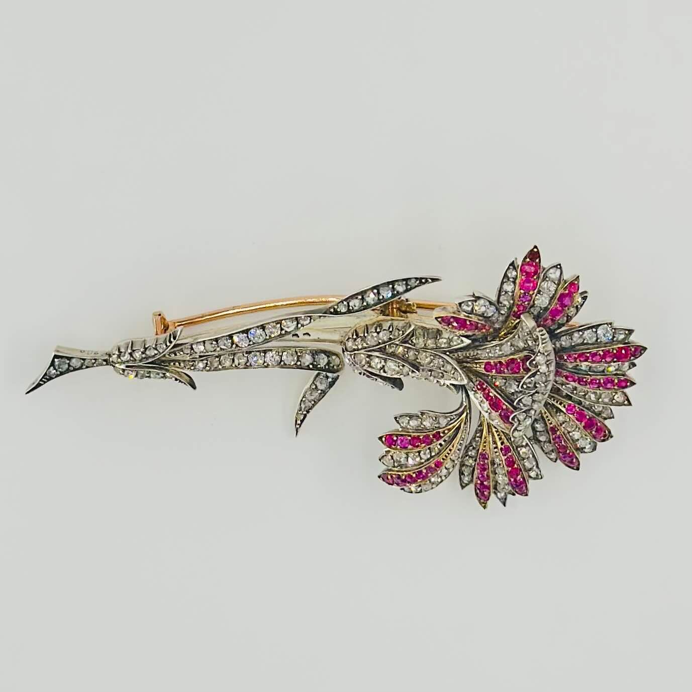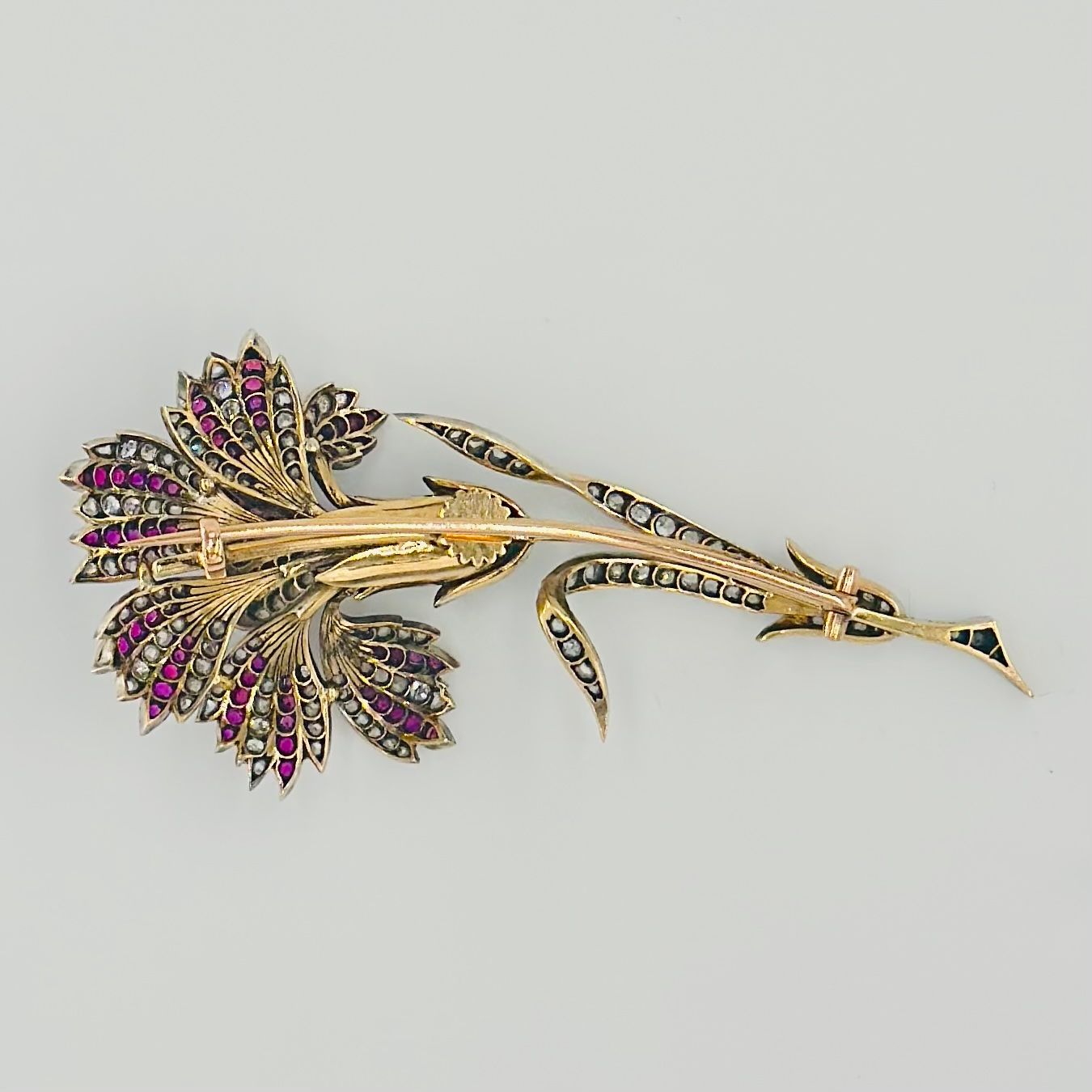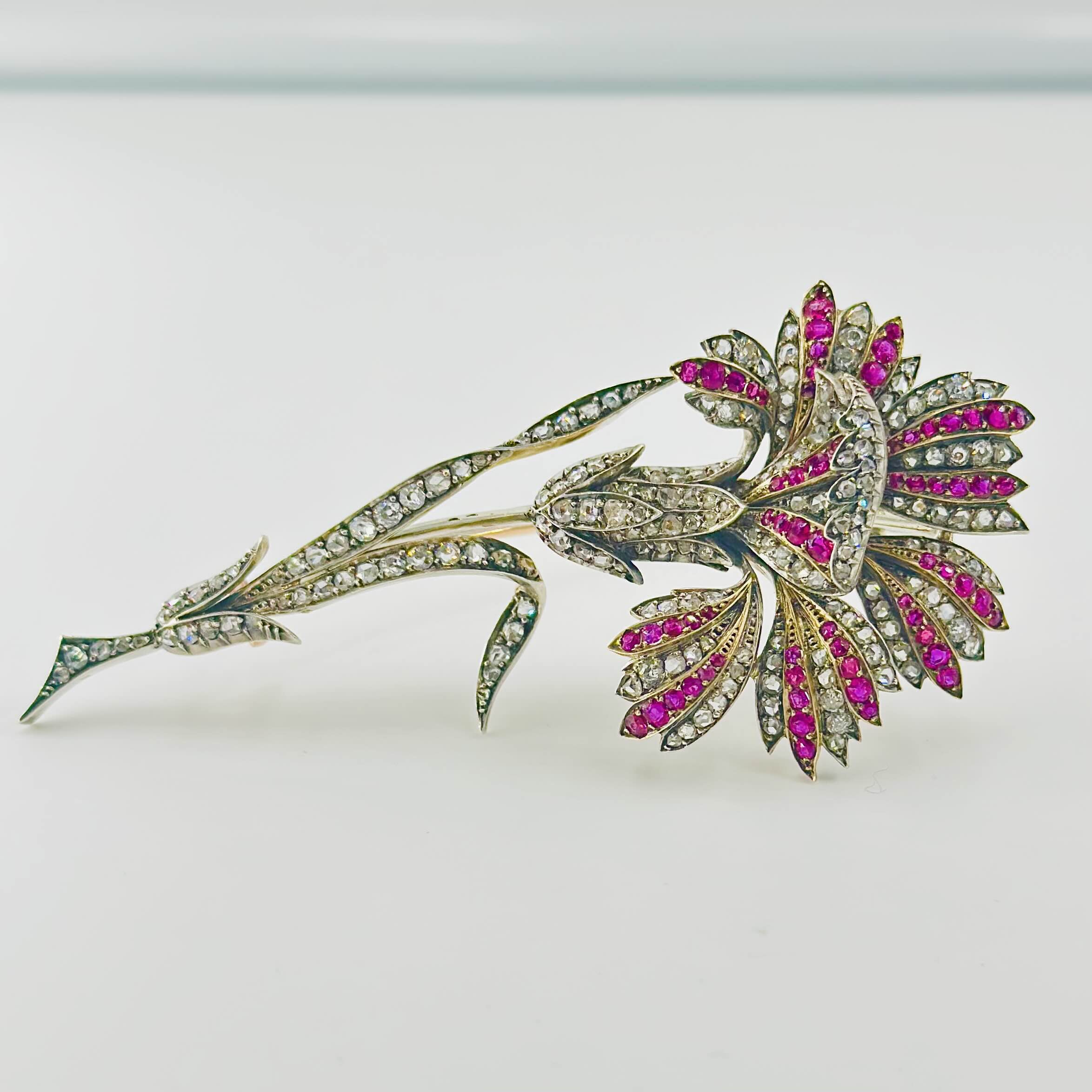 Broche « Oeillet, la monture en or jaune 750/1000(18k) et argent, la fleur sertie de diamants et rubis.
