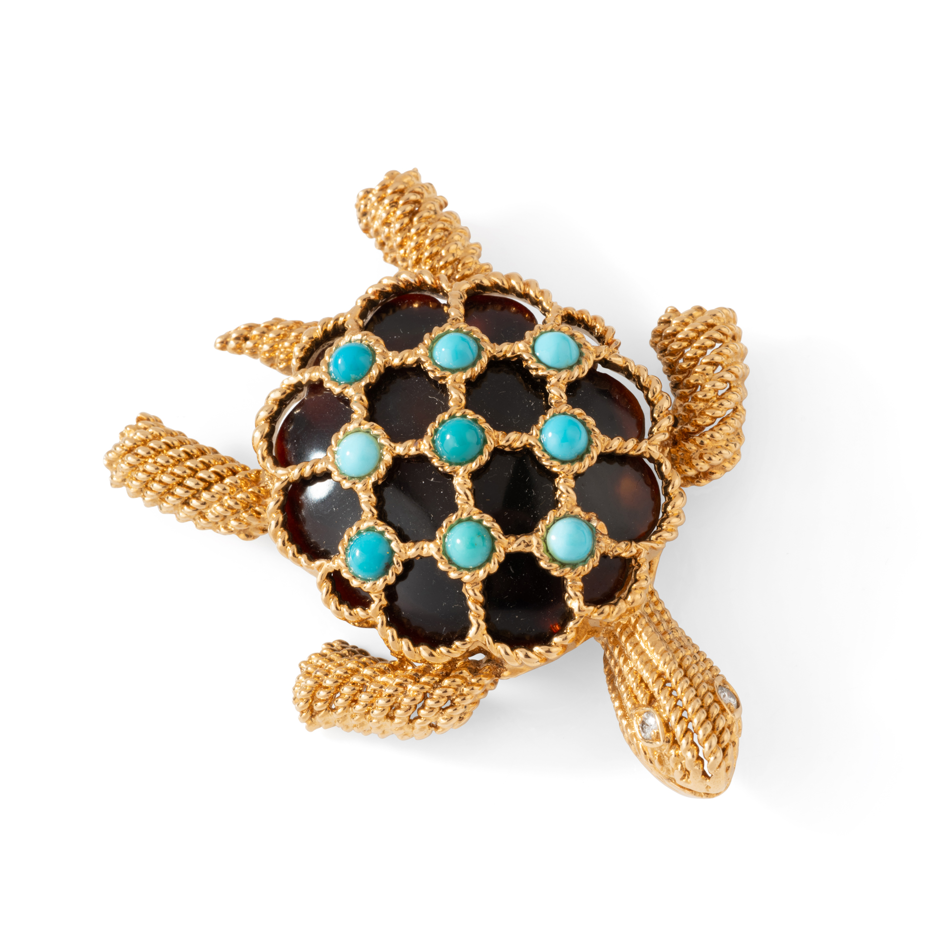 Clip de revers en or jaune 750 millièmes à décor de fils d’or torsadé figurant une tortue, la carapace en écailles de tortue marine spp de la famille des (Cheloniidae spp*). et sertie de petites turquoises de forme cabochon, les yeux ornés de diamants ronds de taille brillant.