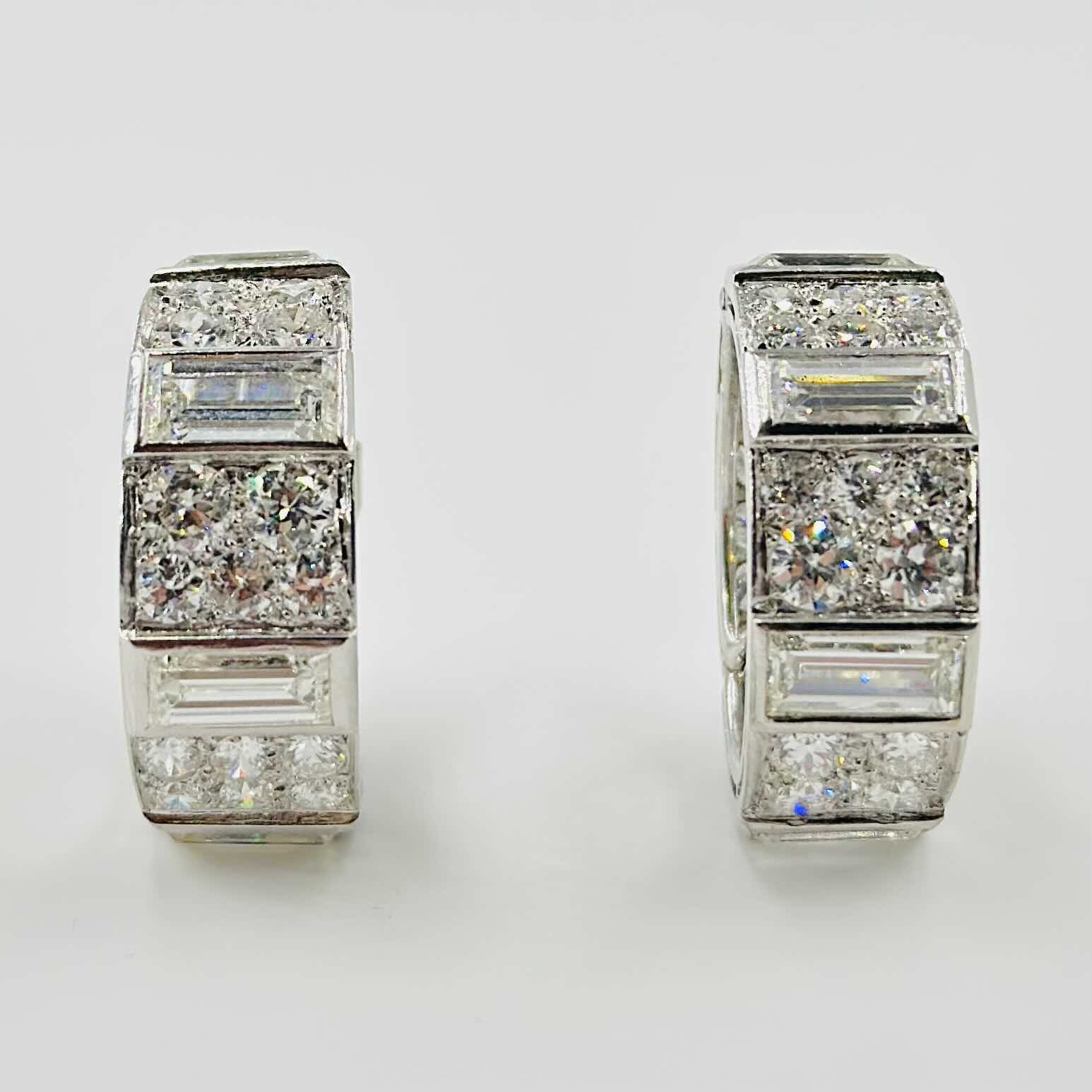 Boucles d’oreilles créoles en platine et diamants taille émeraude alternés de diamants taille brillant.